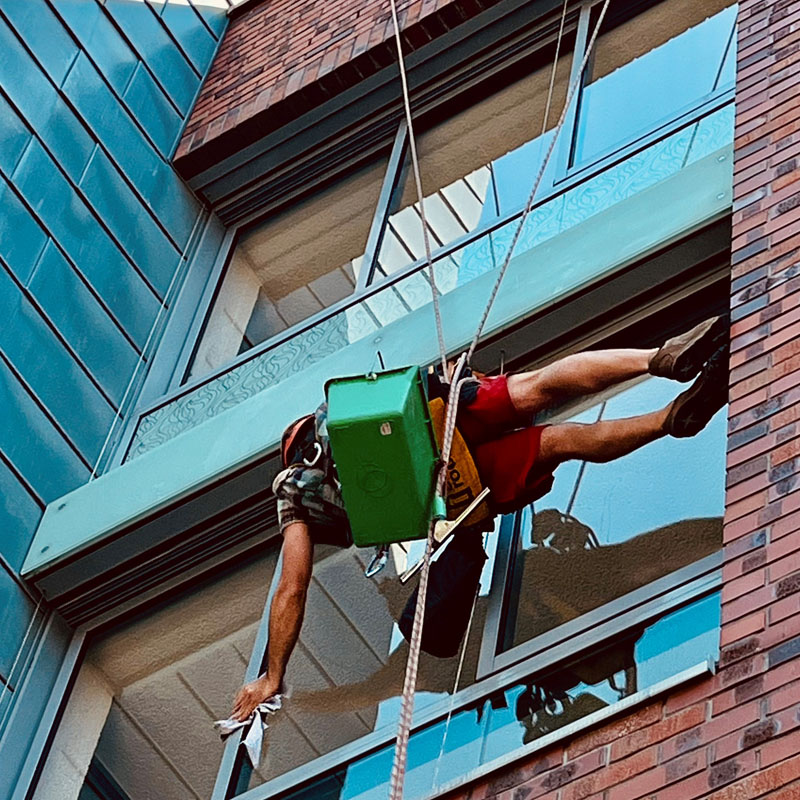 Durch die Seilzugangstechnik ist es uns möglich Glasscheiben zu reinigen, die vom Haus aus nicht zugänglich sind z.B. das Reinigen von Fahrstuhlschächten.